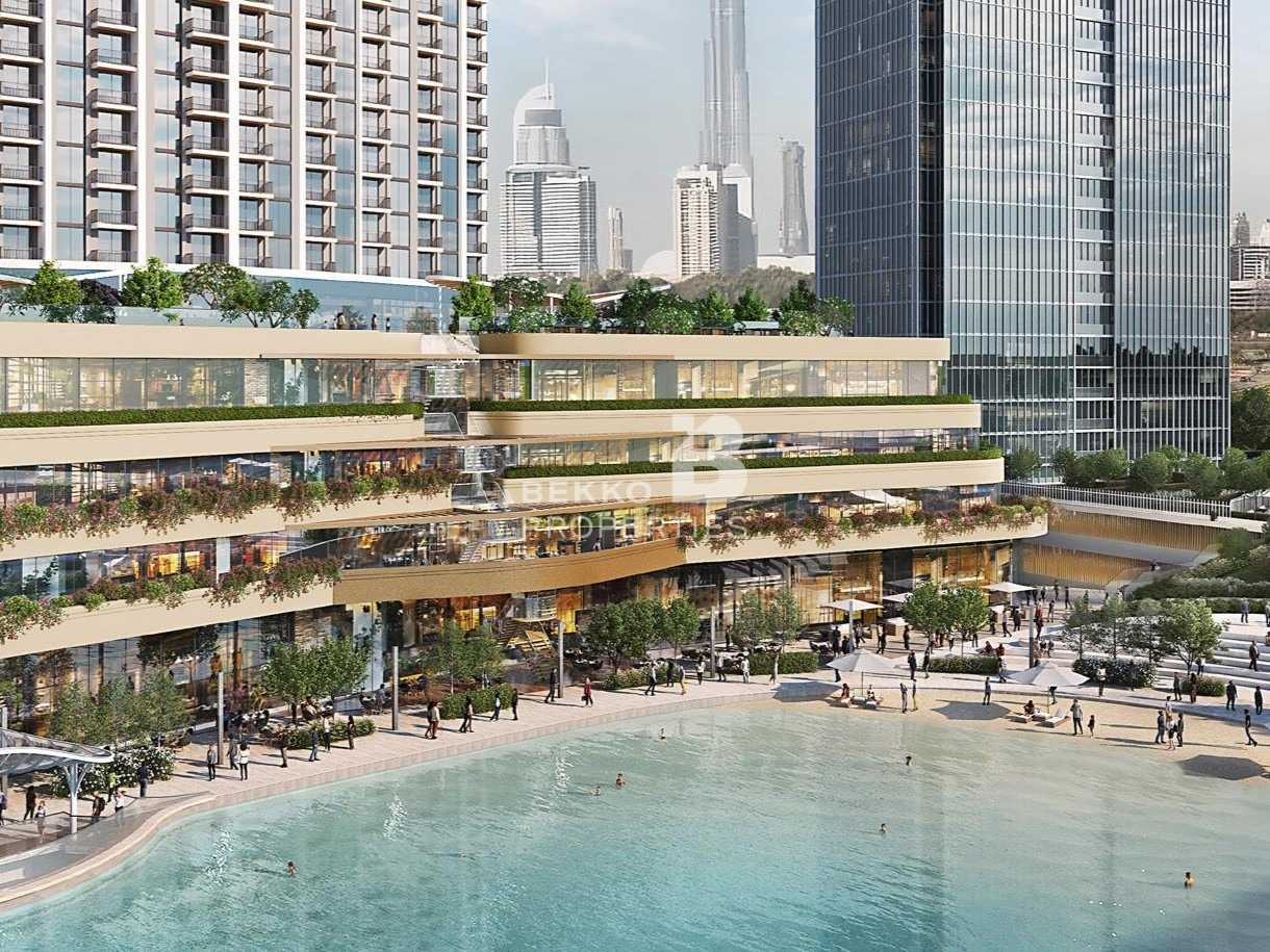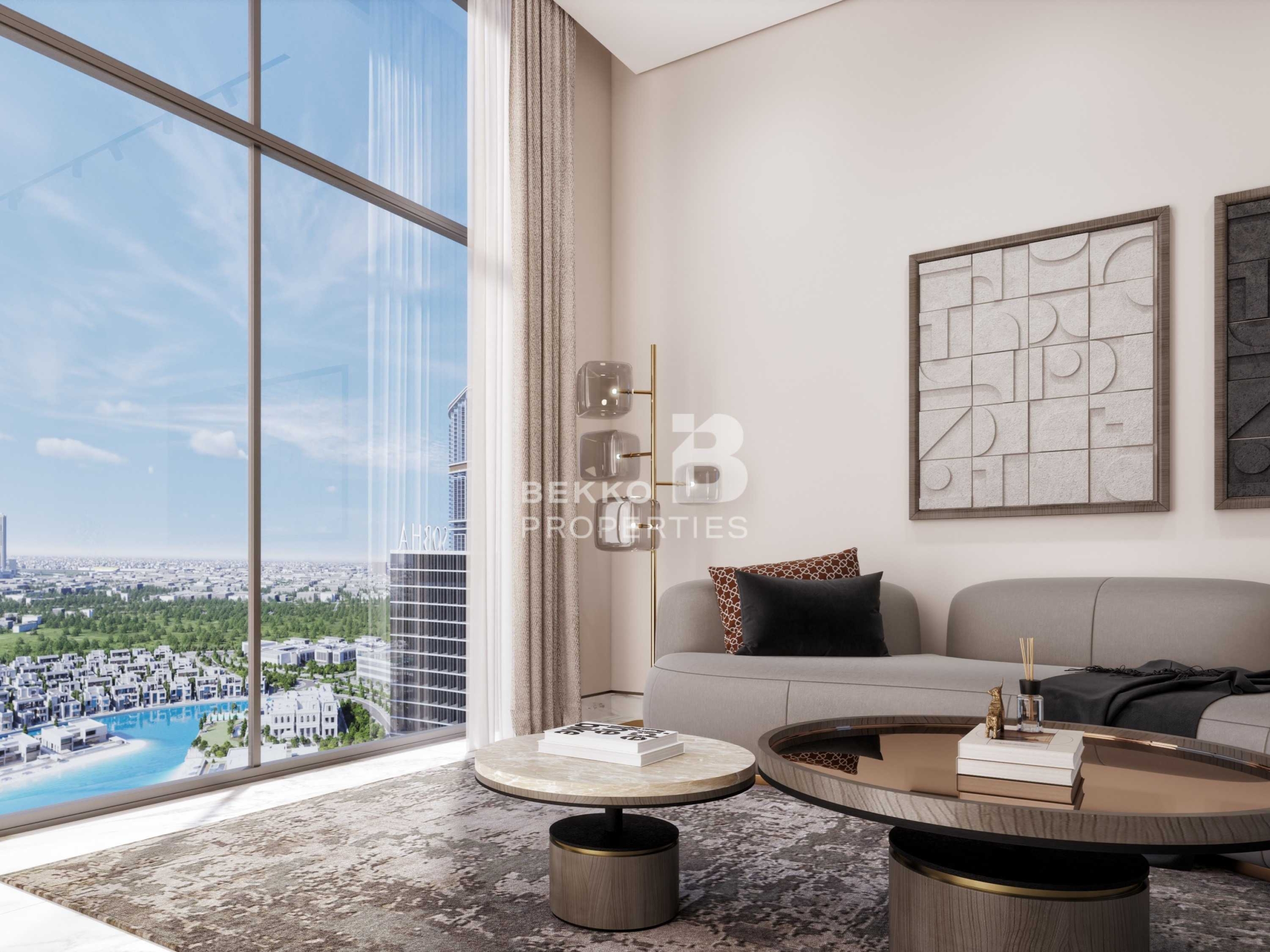 Enjoy elevated living on a high floor with breathtaking panoramic views of the Hartland waterfront and Downtown Dubai skyline from this meticulously designed 2-bedroom residence.